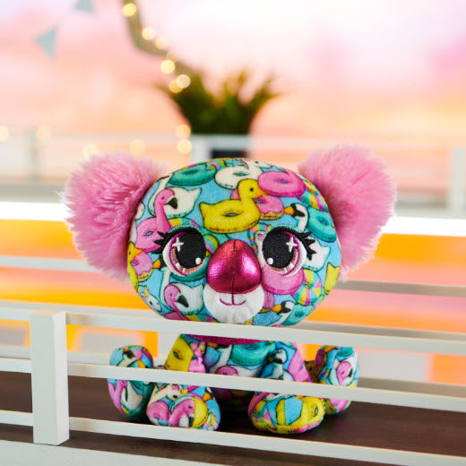 Can you say pool party? Angie Springs loves making a splash! This cute koala is covered in a playful and colorful pool float print. She has a hot pink nose, collar, and eyes with teal blue eyeshadow. Angie features an adorable fluffy pink tail and ears.