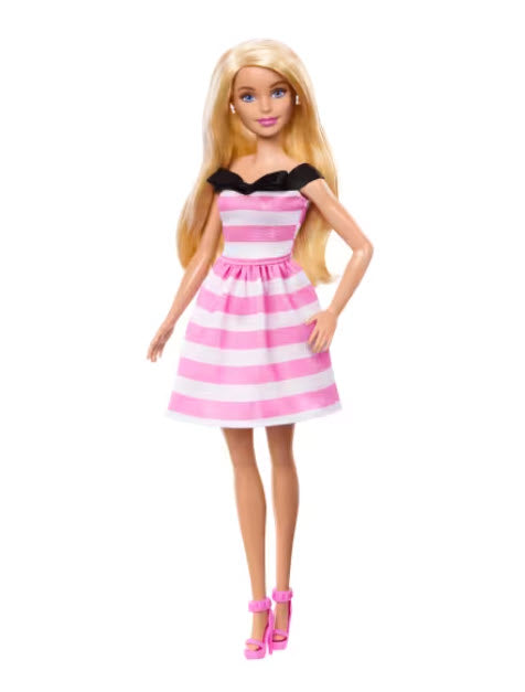 Celebrate the 65th anniversary of Barbie with this commemorative Barbie doll! She rocks a pink and white striped dress accented by a black bow detail at the neckline. Pearly earrings and pink heels complete her classic look! This doll makes a lovely gift for both kids and Barbie fans of any age.