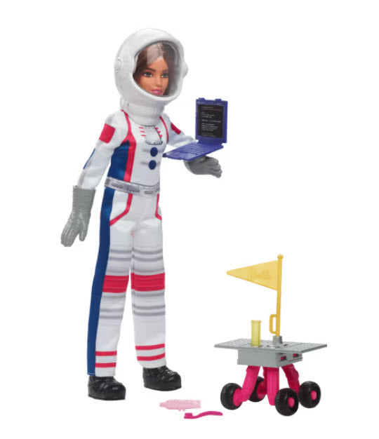 Celebrate Barbie doll's 65th anniversary with a collection of fashion dolls highlighting fan-favorite careers like this astronaut set. Barbie doll wears a spacesuit with iconic pink touches and comes with 10 themed accessories, including a view-changing helmet and rolling space rover! Kids can role-play and dream big -- collectors will want them all! Each doll sold separately, subject to availability. Dolls cannot stand alone. Colors and decorations may vary.