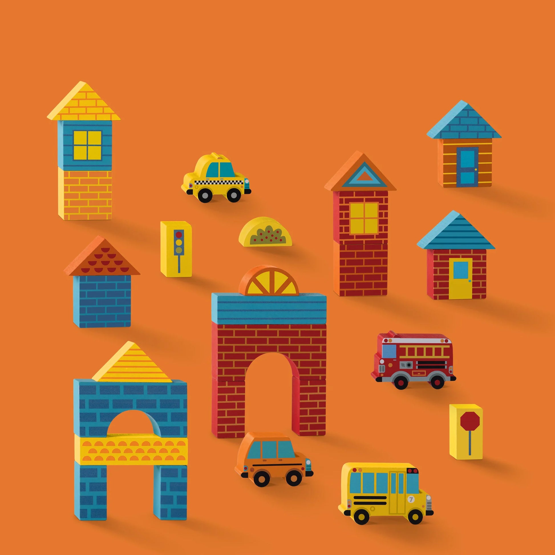 Let's Build! Kids will love our Busy City block set: a beautifully designed wood block set for hours of unplugged fun. Each set includes 31 differently shaped building blocks printed on two sides plus 4 play figures. Great for hours of open-ended, imaginative play!