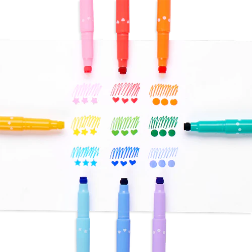 The Confetti Stamp Double-Ended Markers let you draw a pretty picture, and then throw yourself a party on the page. The fine felt tip gives you control over your strokes, while the stamp markers on the other end let you sprinkle confetti shaped stamps all over your artwork. Available in 9 sweet and playful colors, these stamp markers are great for cute art, decorating planner pages, homework, and any just-for-fun projects. Suitable for ages 6 and up