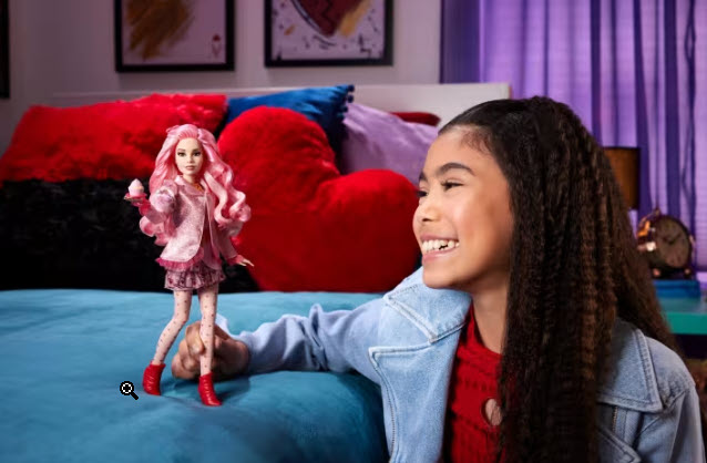 Spread bubbly positivity with this doll of Bridget, Young Queen of Hearts, from Disney Descendants: The Rise of Red! With her soft pink waves and charming outfit, this fashion doll looks just like the sweetheart she is in the movie. She bends at the arms, elbows, wrists and knees for sugary sweet poses with her cupcake accessory. Makes a great gift for fans who will want to collect them all! Each sold separately, subject to availability. Doll cannot stand alone. Colors and decorations may vary.