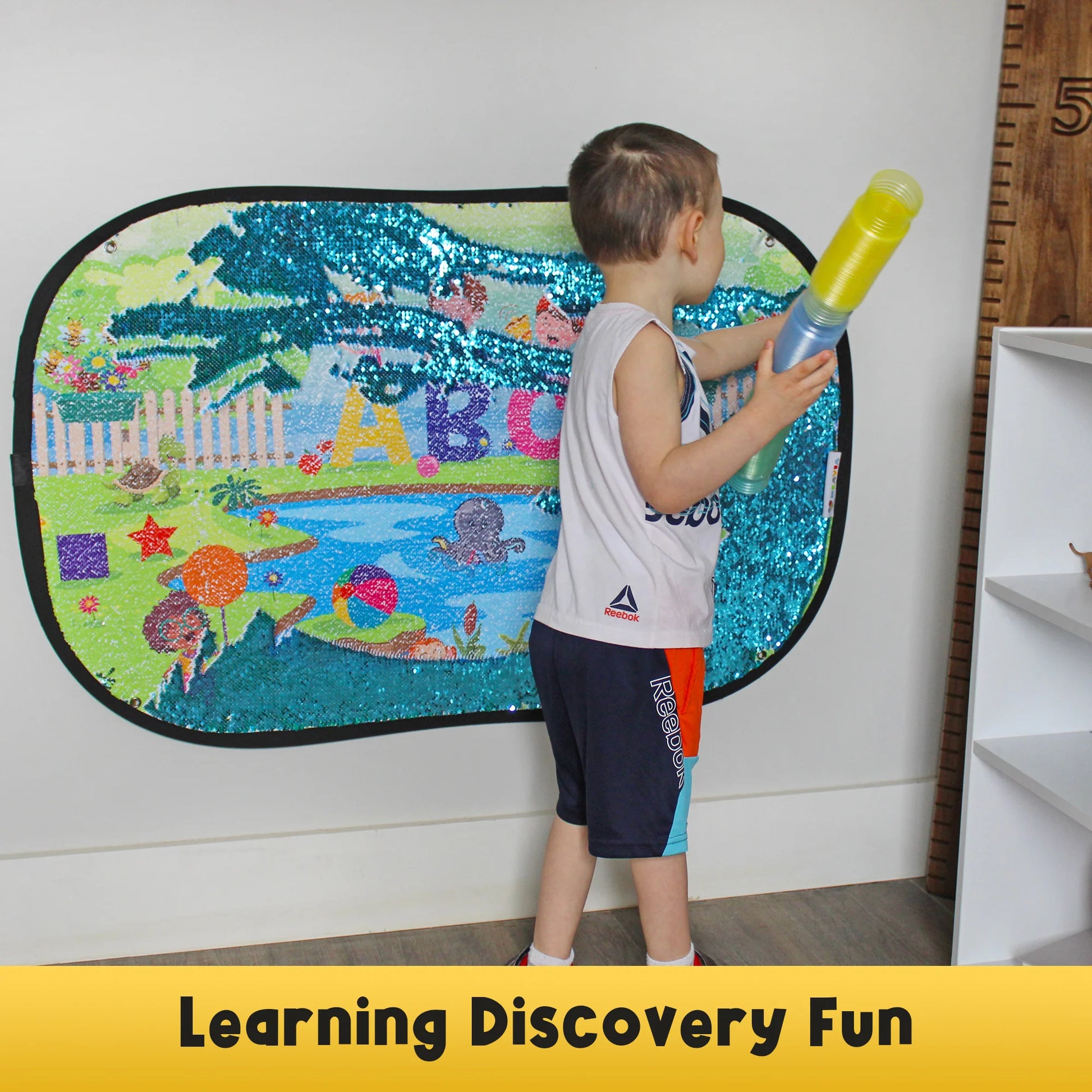 Our reversible sequins fabric is designed to captivate and educate young minds. On one side, vibrant and engaging printed graphics encourage kids to embark on a journey of discovery, while the reversible sequins on the other side provide a unique tactile experience that children of all ages love. This versatile fabric unfolds into a spacious and creative play area, complete with grommets in each corner for sensory wall, floor, or table use in any setting. A must-have for sensory rooms, this fabric delivers both visual and tactile stimulation, sparking imagination and learning. And when it's time to take the magic on the go, the fabric conveniently folds down and comes with a premium travel bag. Enjoy playtime with this reversible sequins fabric that fuses fun and education effortlessly.