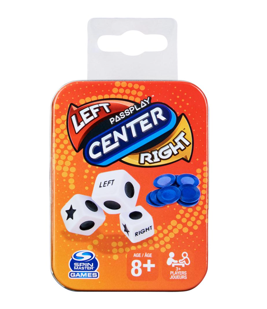 PASSPLAY: THE GAME OF LEFT CENTER RIGHT is the addictive family dice game that's fast-paced, fun-to-play, and now even easier to bring along! The dice and tokens store inside the portable tin container bring it with you and you'll always be ready to play. Starting with 3 tokens, each player takes turns rolling all 3 dice and then does what the dice say. Roll Left, Center, or Right, and pass a token in that direction. Roll a Dot, and you can keep what you've got 3 Dots is the perfect roll. Out of tokens? You're not out of the game the player to your left or right might pass you a token. When one player has all the tokens, they win big! Throw the tin in your bag and bring some fun to your next vacation or get-together with family and friends. Fun and suspenseful with every roll, PASSPLAY: THE GAME OF LEFT CENTER RIGHT is for 3 or more players, ages 8+