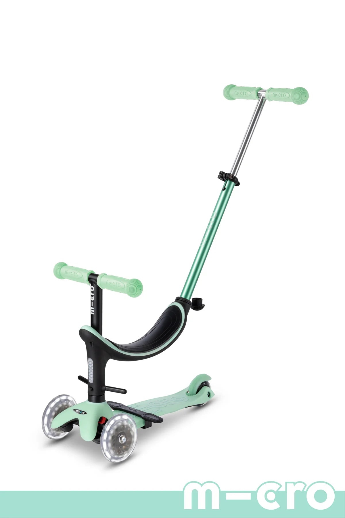 The innovative and ergonomic all-in-one scooter can be used in four different variations: at the very beginning with seat, two footrest options, and push bar for the parents; later on without the parent’s push bar, as a mix between balance bike & scooter; as a starter scooter for young riders; and finally as a classic Micro Mini Scooter with LED wheels.