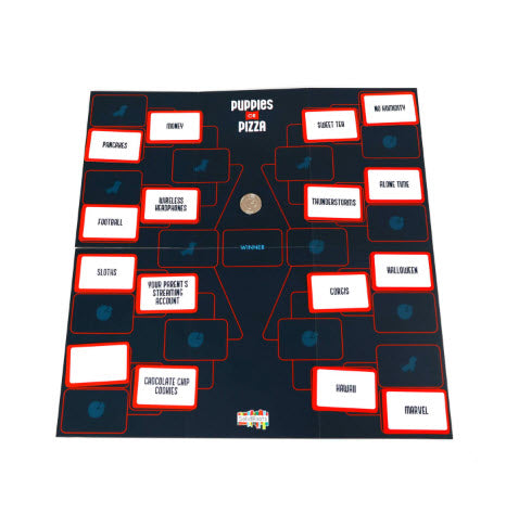 We've all had to choose between 2 terrible things but this one is full of all GREAT things. You and your group have to vote on what you can't live without. Puppies or Pizza can be played multiple ways, but the easiest is to draw cards, set them up on the board in a tournament-style bracket, and vote on each set until you only have 1 card left. Simple, right? Uh...have you ever tried to decide where to eat with more than 3 people? Impossible. It's like that, only with higher stakes... The perfect game to get to know people better, play in larger groups, or for a casual conversation night. Though we should warn you that discussions can get heated.