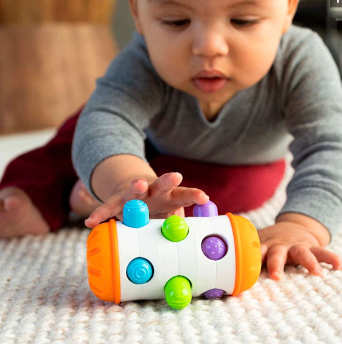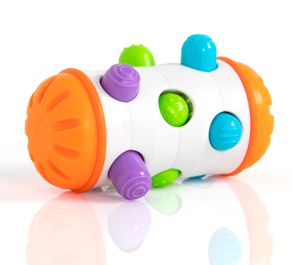 Roll into wonder! The colorful textured pegs move in and out as the cylinder rolls on its soft silicone tires.
