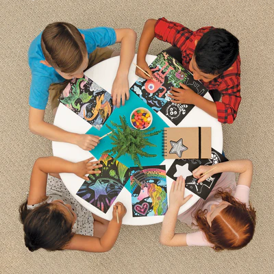 Scratch to reveal amazing dragons with the Fantastic Dragons Scratch and Scribble scratch art kit. It’s easy to create incredible works of art with the 4 guided illustrations that are super easy for kids to follow. Or use your imagination to scratch your own design onto the unguided 2 rainbow cards or the 2 sparkle cards; the rainbow and sparkle are hidden until you scratch in your design. And once you’re done scratching the fun doesn’t end there. You can frame the cards, or cut out the designs to create new characters to play with! Plus the sticker sheet can be scratched to reveal more colorful sparkly fun!